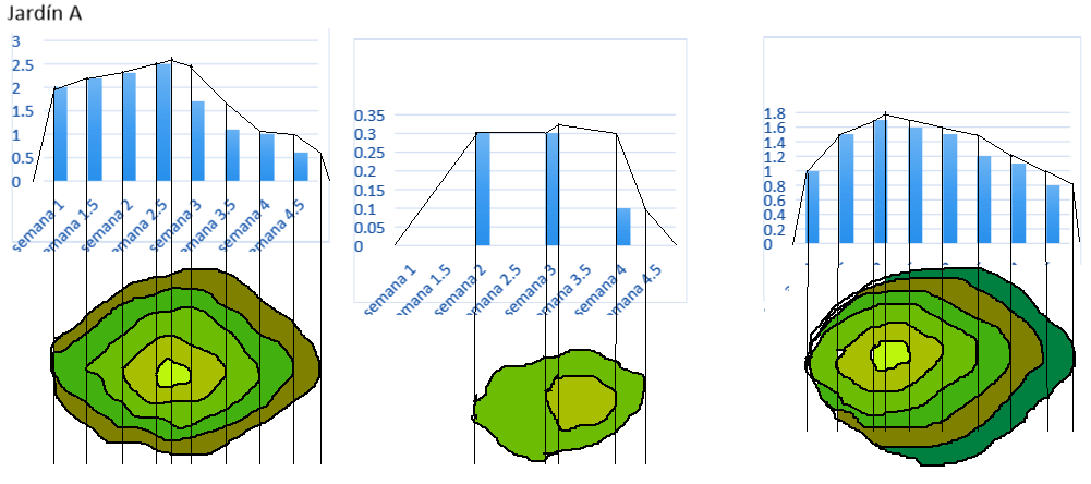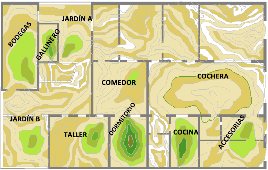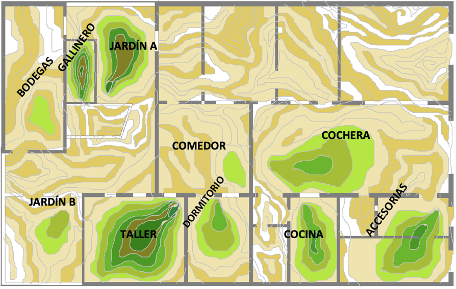 Inicio de modificaciones durante el mes de abril. Probablemente el mes de mayor actividad física. Nótese la relación entre el crecimiento de “relieves” que simulan la intensidad de actividad y el cambio de nombre en algunos espacios, que indica el cumplimiento del primer objetivo: adecuarlos a nuevas necesidades.